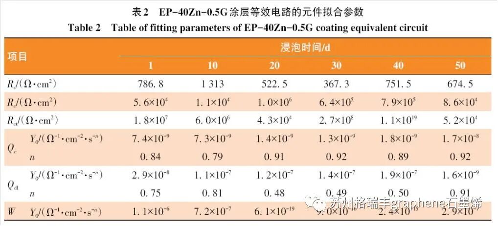 由表2可知,在涂层的物理阻隔期(480-960h),界面双电层电容对应的等相位角元件对应的指数均近似等于0.5,与一个Warburg阻抗相似。同时,界面电荷传递电阻由104 Ω·cm2显著提高到1019 Ω·cm2,电极反应受限于腐蚀介质在涂层内的传质过程。这些结果进一步证明了高质量薄层石墨烯能够凭借自身优异的物理屏蔽特性显著提升涂层的物理阻隔性能。